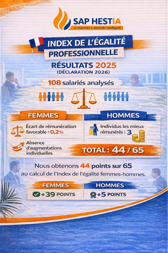 Chez SAP HESTIA, l’égalité professionnelle entre les femmes et les hommes constitue un engagement concret et durable. Conformément à nos obligations légales, nous avons procédé au calcul et à la publication de notre Index de l’égalité professionnelle au titre de l’année 2025. Cette déclaration a été effectuée en février 2026 et repose sur l’analyse de 108 salariés pris en compte dans le calcul des indicateurs.